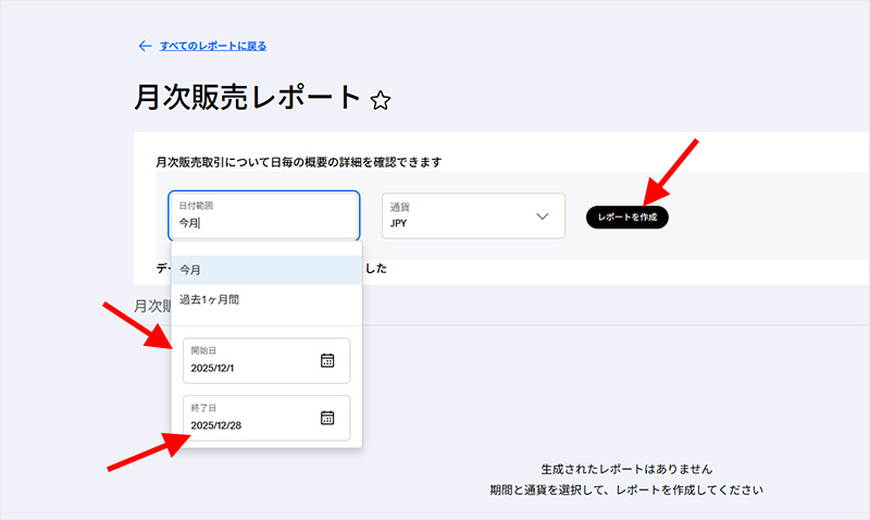 11月末の残高を知りたい場合は11月1日~11月30日を設定し、レポート作成してください。