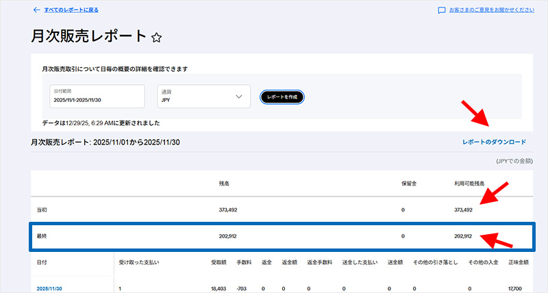 下記のように「最終」が11月末でのPayPal口座残高になります。