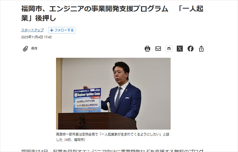 福岡市がエンジニア向けに「一人起業」を後押しする事業開発支援プログラムをスタート。